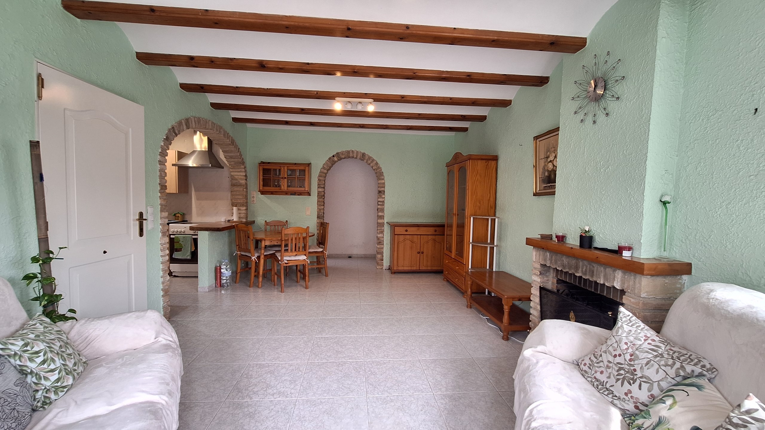 The entrance is via a traditional covered naya, a wonderful space to relax while overlooking the sun-drenched, south-facing gardens. From here, you step into a bright and welcoming open-plan living and dining area, complete with a feature open fireplace, creating a cosy yet spacious atmosphere. The adjoining kitchen is thoughtfully designed with fitted appliances and a convenient breakfast bar, complemented by a practical utility room just off the kitchen.