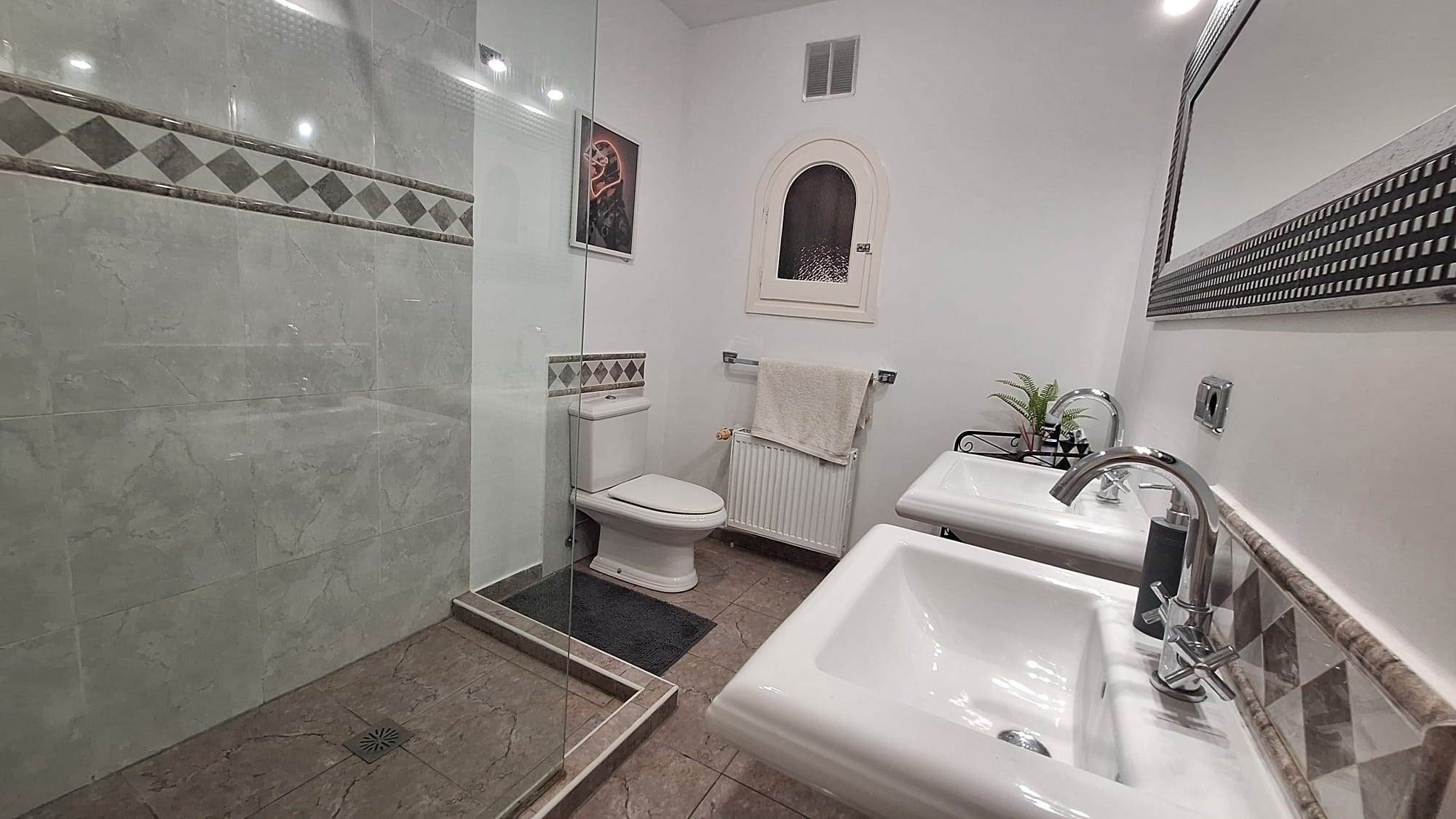 Additional features include gas central heating, air conditioning, ceiling fans, and double-glazed windows throughout, ensuring year-round comfort.