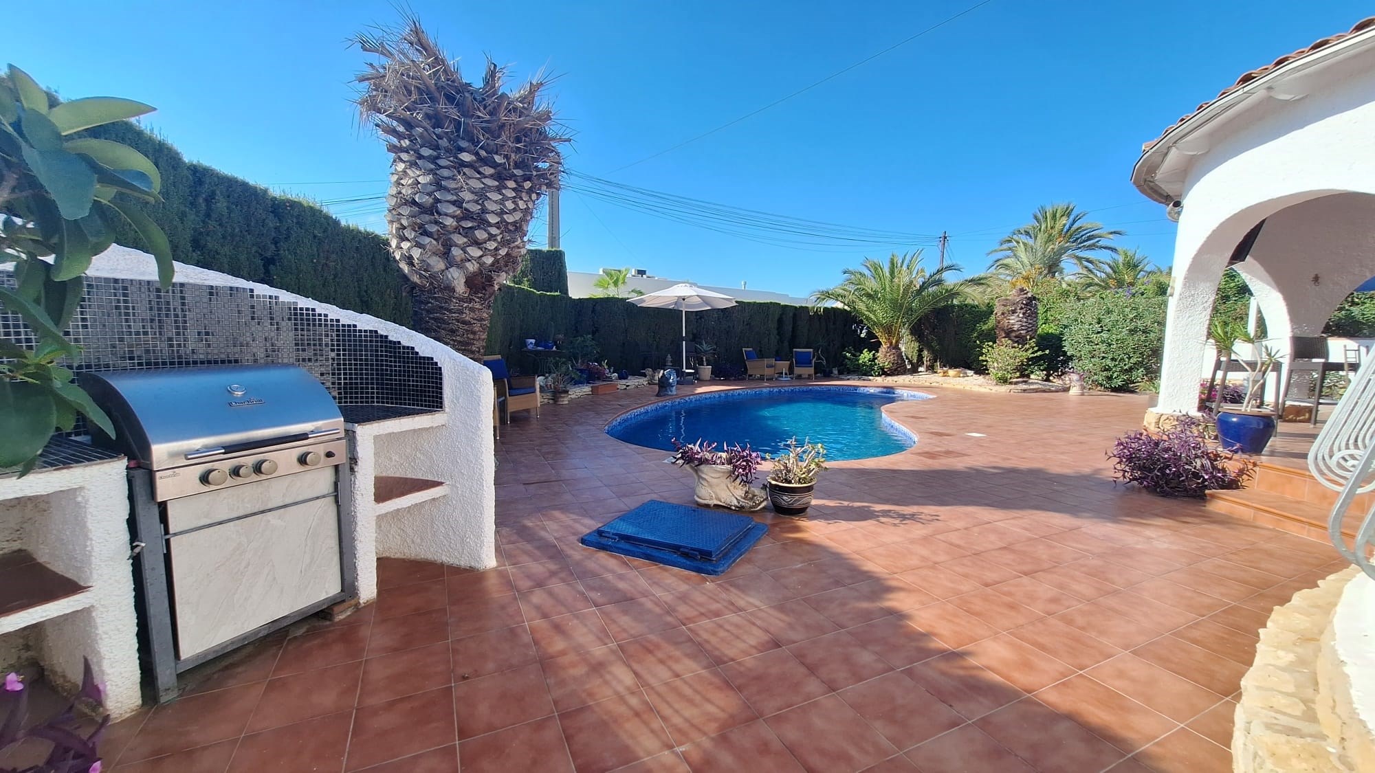 As you step onto the property, you are greeted by low-maintenance landscaped gardens, a generous sun terrace, and a charming covered naya, the perfect spot for relaxing or entertaining while overlooking the inviting swimming pool.