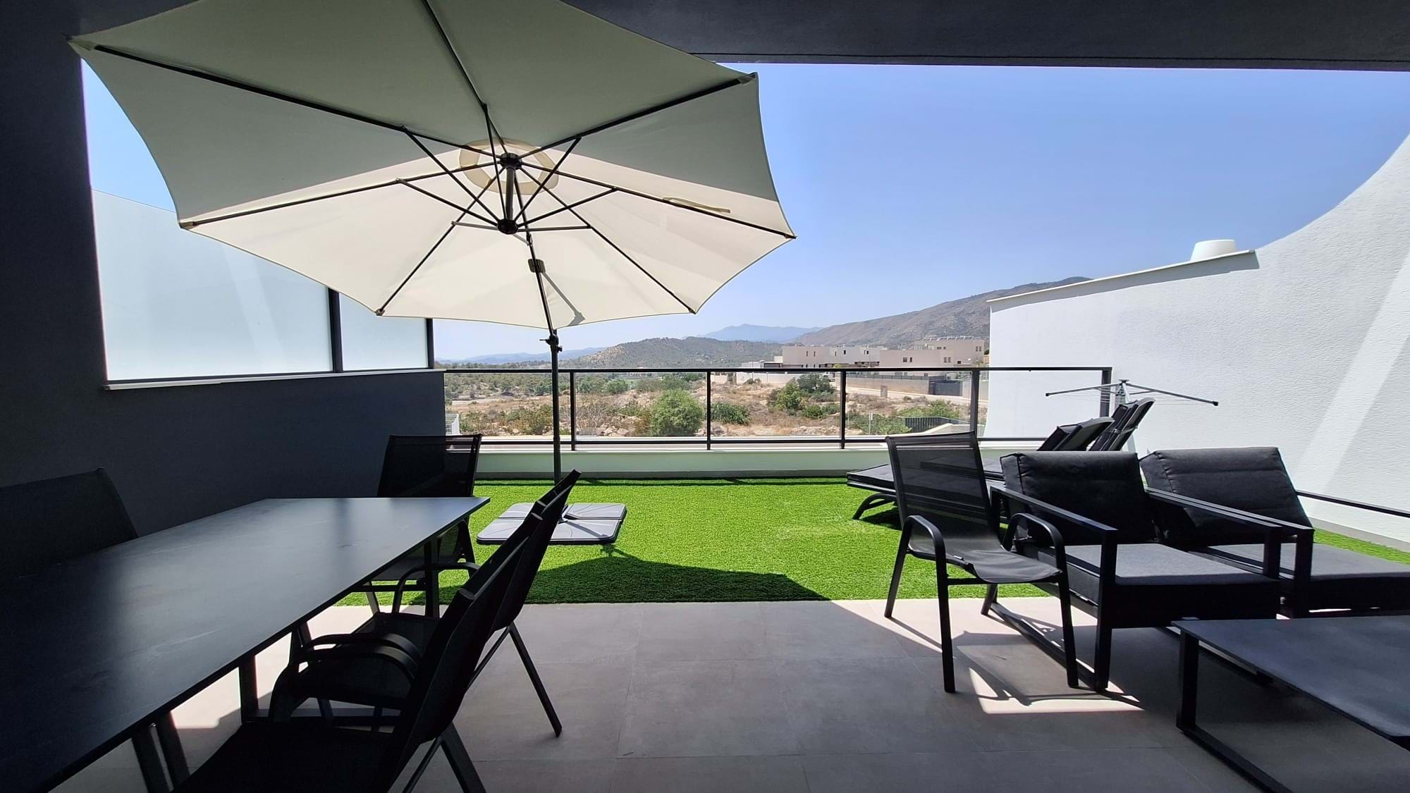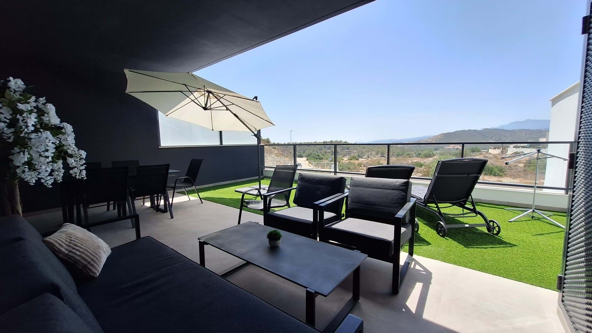 As you step inside, you are greeted by a spacious open-plan living area that blends effortlessly into a high-specification kitchen, complete with fully integrated high-end appliances ideal for modern living and entertaining. The living space extends out through large glass doors to a generously sized private west-facing terrace, offering far-reaching views and the perfect spot for enjoying the Mediterranean sunsets.