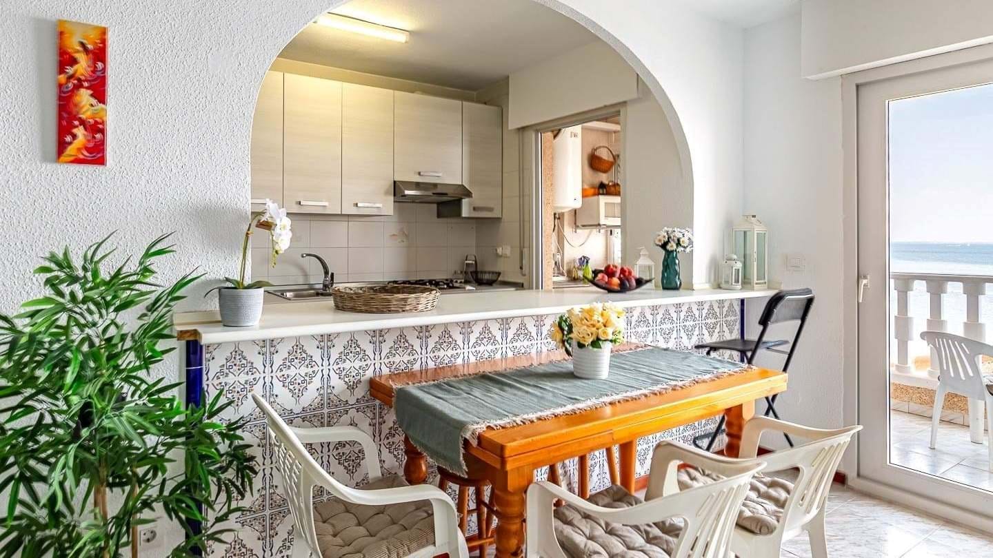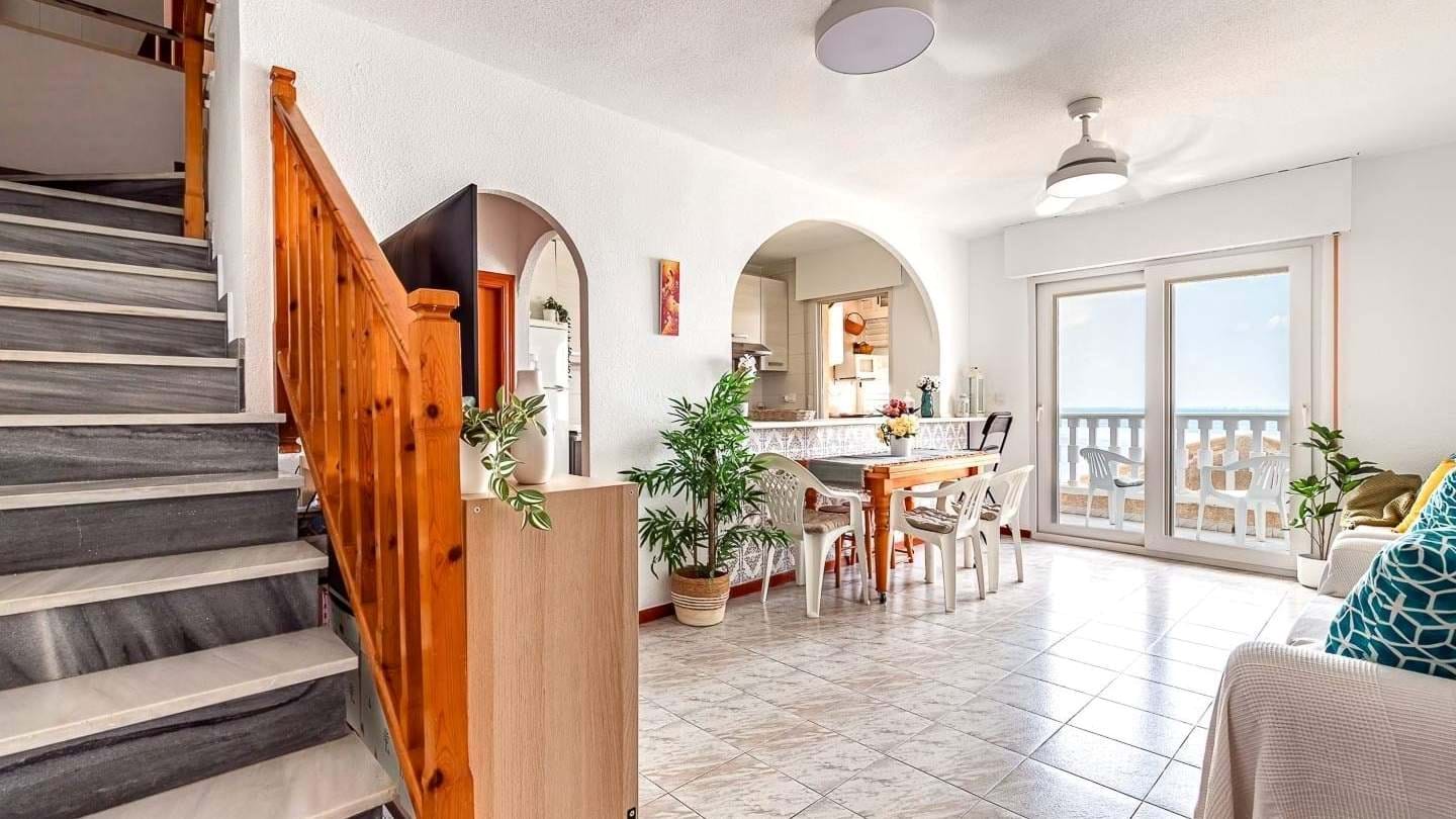 The apartment is spread over two levels, on the third and fourth floors of the building, with a layout thoughtfully designed to separate the living area from the sleeping area and provide maximum comfort. On the lower floor, you will find a bright and spacious living-dining room, designed for family life and relaxation. The modern, functional, and fully equipped open-plan kitchen integrates seamlessly into the space, offering convenience and fluidity. From this floor, you access a glazed gallery with a water heater that leads to a balcony with unobstructed, stunning views of the Mar Menora privileged spot to enjoy unforgettable sunsets right on the beachfront. Additionally, this floor includes a fully equipped guest toilet and a practical separate pantry that provides valuable extra storage space.